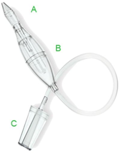 The Baby-Vac™ doesn't need to be fully sterilised. It's enough to sterilise only the evacuator (A) by immersing it into boiling water occasionally. You can also clean the nose tip with isopropyl. However, washing the device with hot soapy water after every use is necessary.